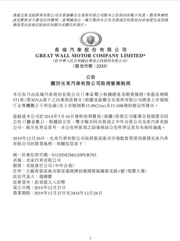 12月30日,长城汽车发布公告称,宝马集团与长城汽车的合资公司光束汽车有限公司已经取得张家港市市场监督管理局颁发的营业执照。 公告内容显示,合资公司类型为有限责任公司(中外合资),住所位于江苏省张家港市经济技术开发区,法定代表人为赵国庆,注册资本为70亿元人民币,成立日期为20